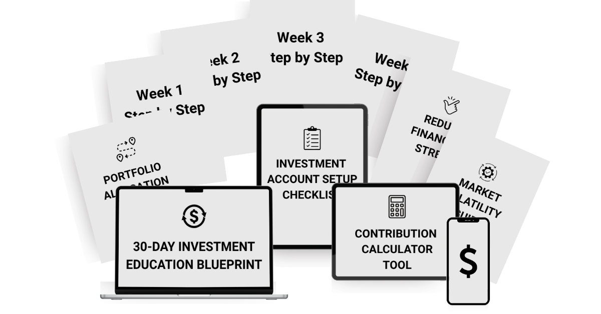 You are getting the complete 30-Day Investment Education Blueprint, plus the Investment Account Setup Educational Checklist, Contribution Calculator Tool, and Market Volatility Education Guide.